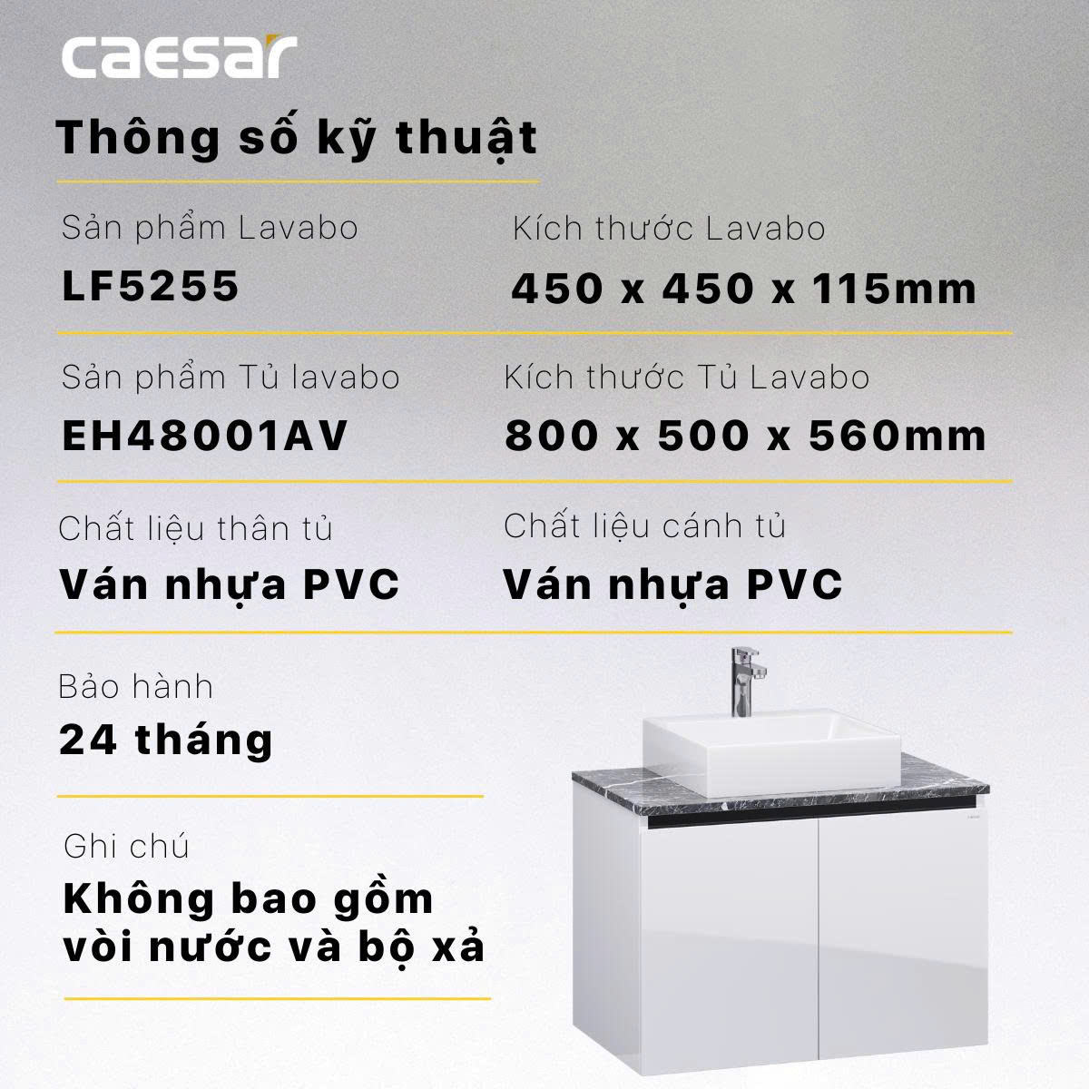 2. Thông Số Kĩ Thuật Bộ Tủ Chậu Treo Tường Caesar LF5255/EH48001AV