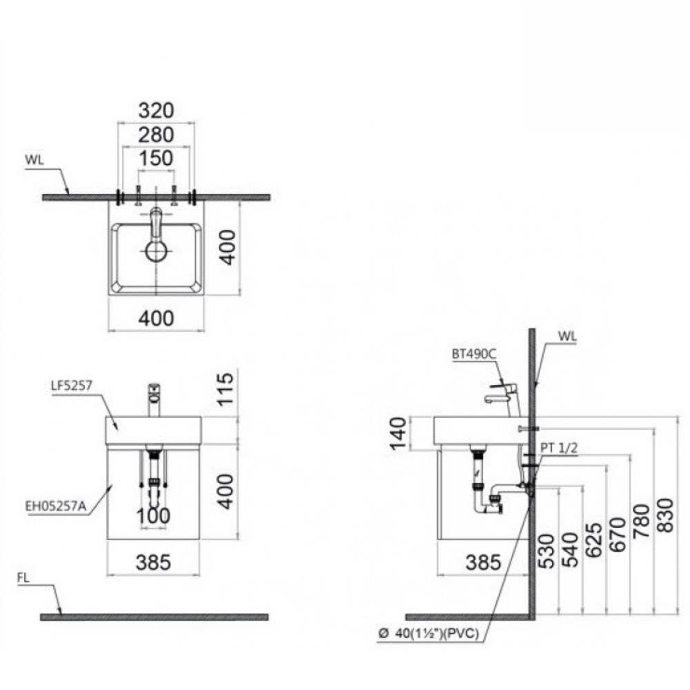 2. Bản Vẽ Bộ Tủ Chậu Treo Tường Caesar LF5257/EH05257AV