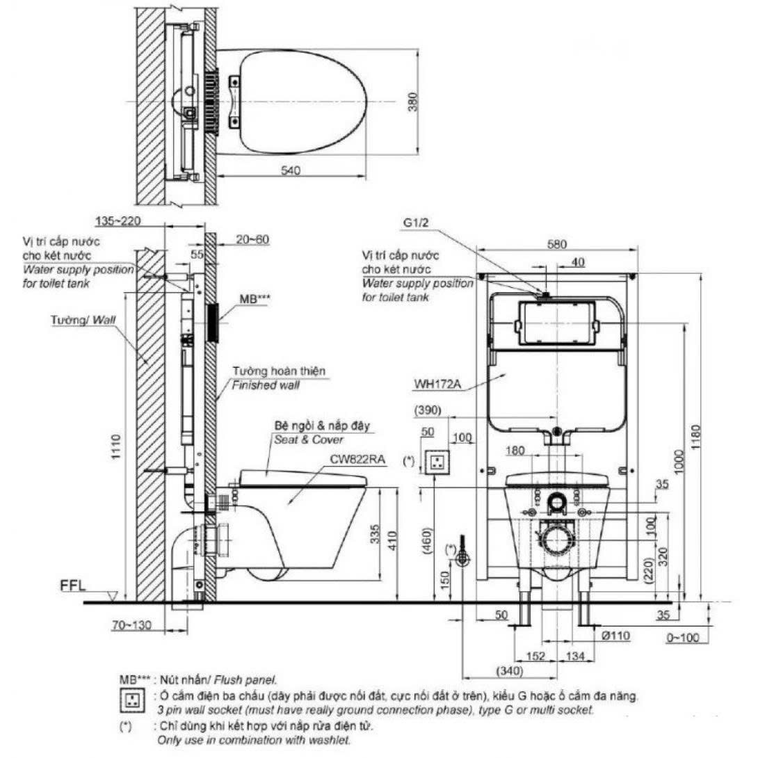 Bản vẽ Bồn Cầu Treo Tường TOTO CW822RA/TC600VS