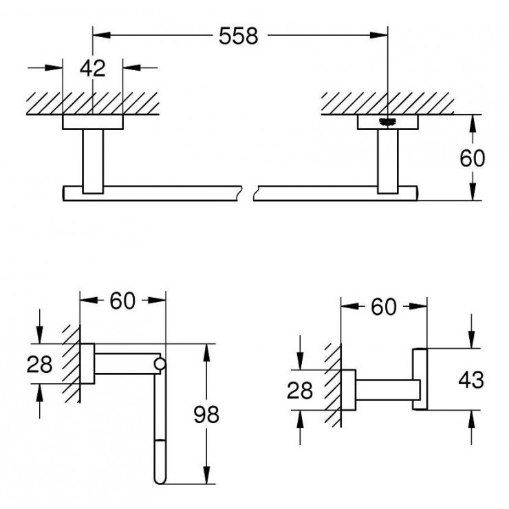 - Bao gồm: Thanh vắt khăn 40509001, móc giấy vệ sinh 40507001, móc áo 40511001