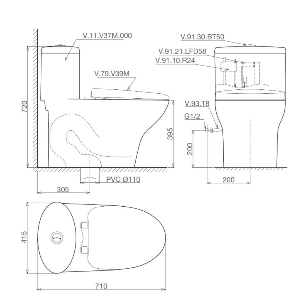 3. Bản vẽ bồn cầu 1 khối kèm vòi xịt Viglacera V37M (nắp êm)