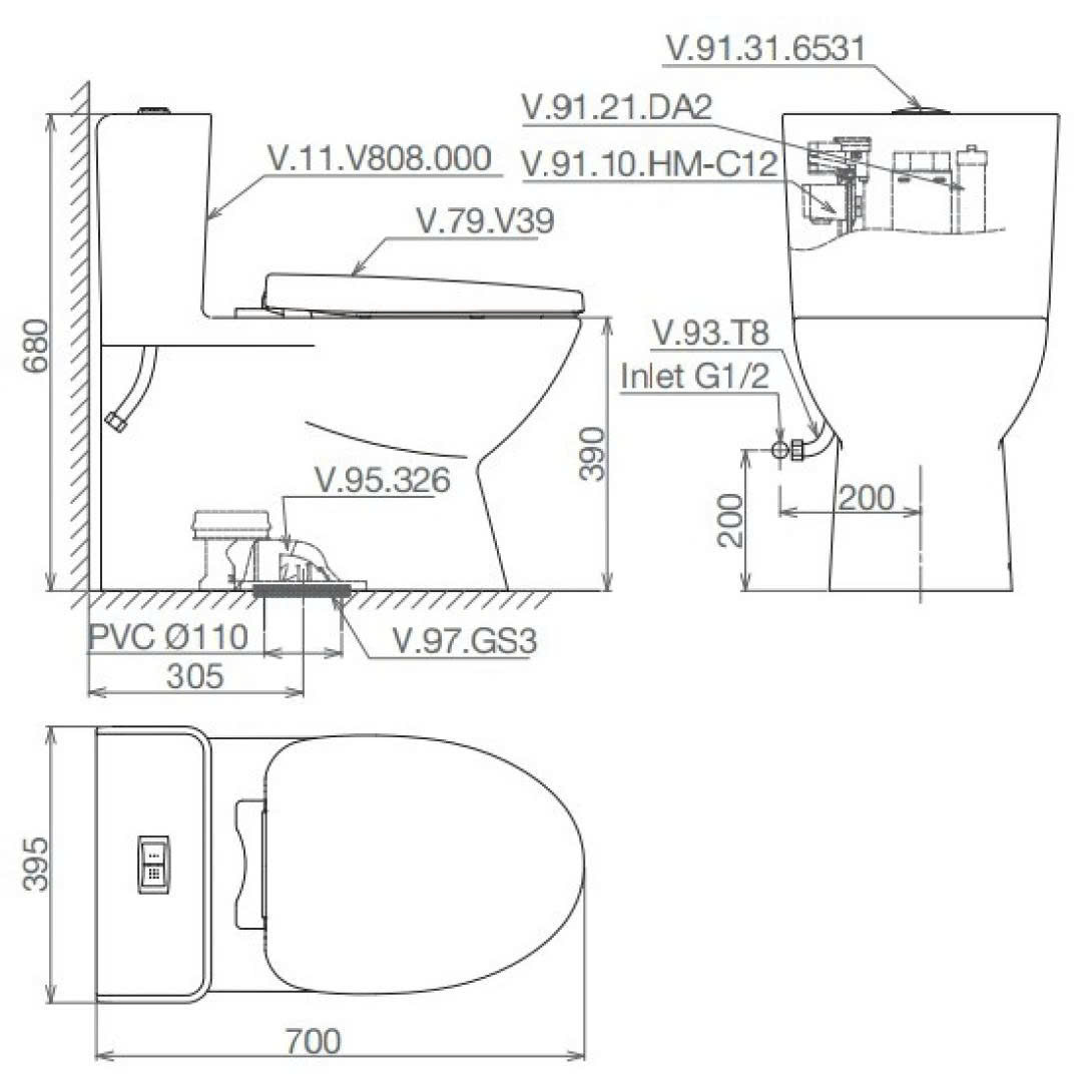 3. Bản vẽ bồn cầu 1 khối kèm vòi xịt Viglacera V808