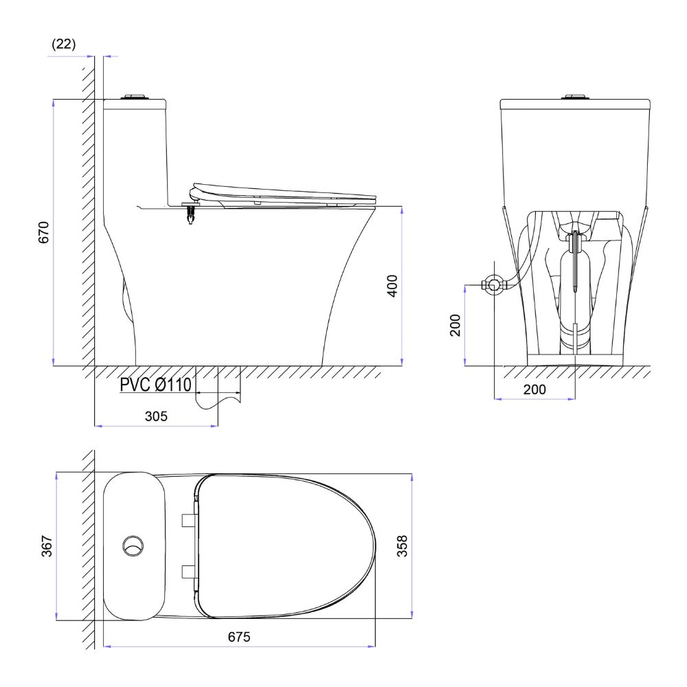 3. Bản vẽ bồn cầu 1 khối kèm vòi xịt Viglacera V829 (nắp êm)