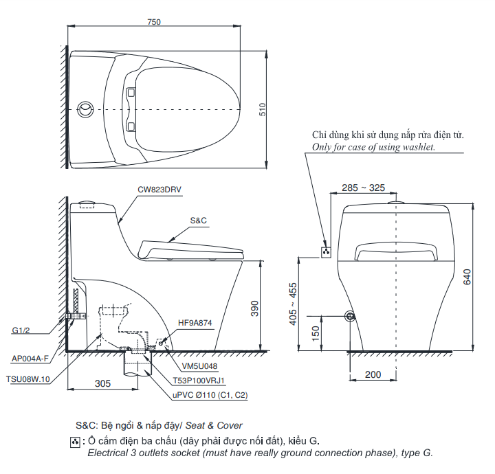 - Phù hợp lắp đặt với nắp rửa điện tử WASHLET (tùy chọn)