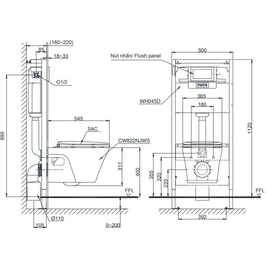 Bản vẽ Bồn Cầu Treo Tường ToTo CW822RA