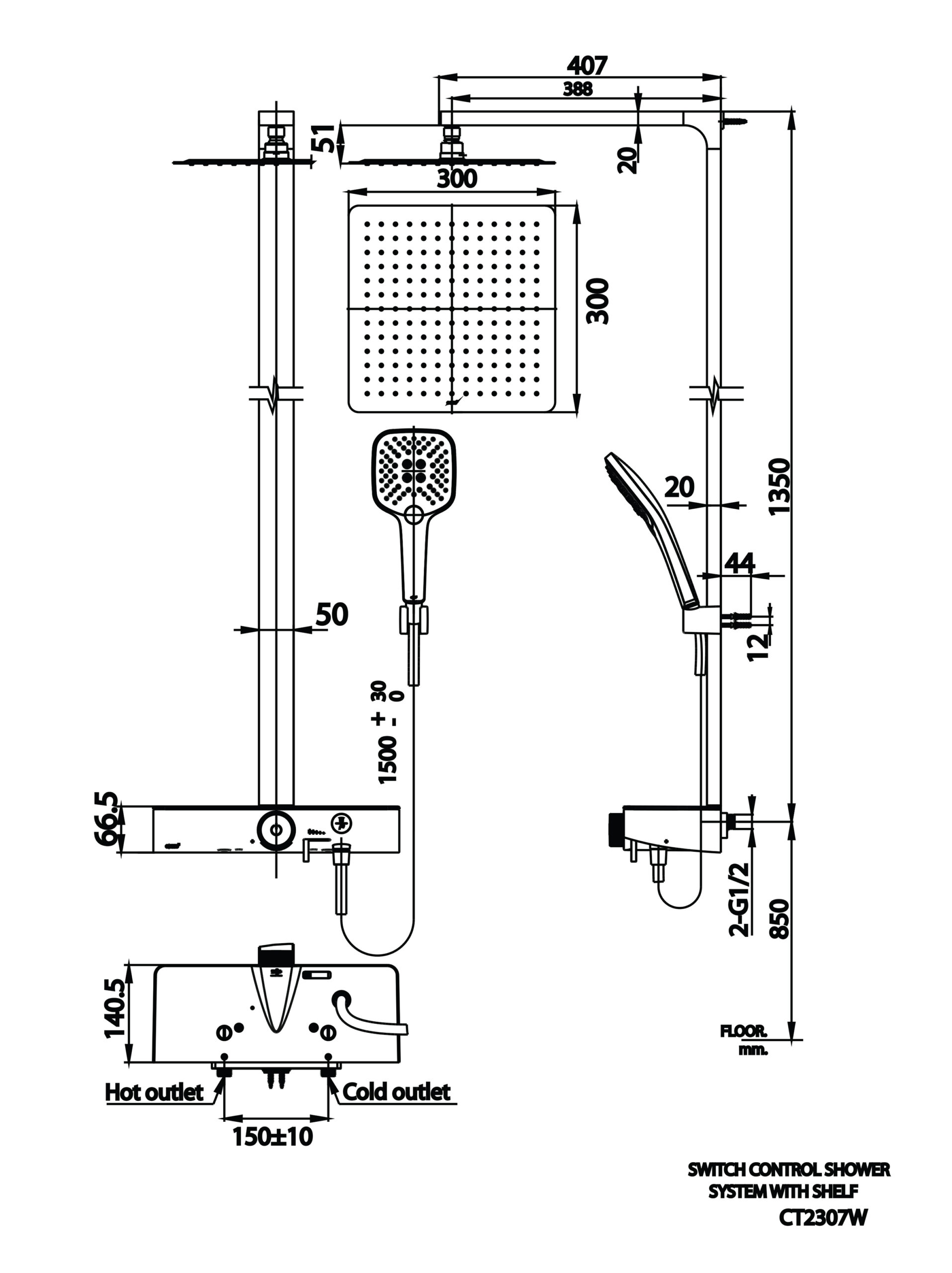 - Đầu sen 12 inch, van hằng nhiệt và giá đỡ