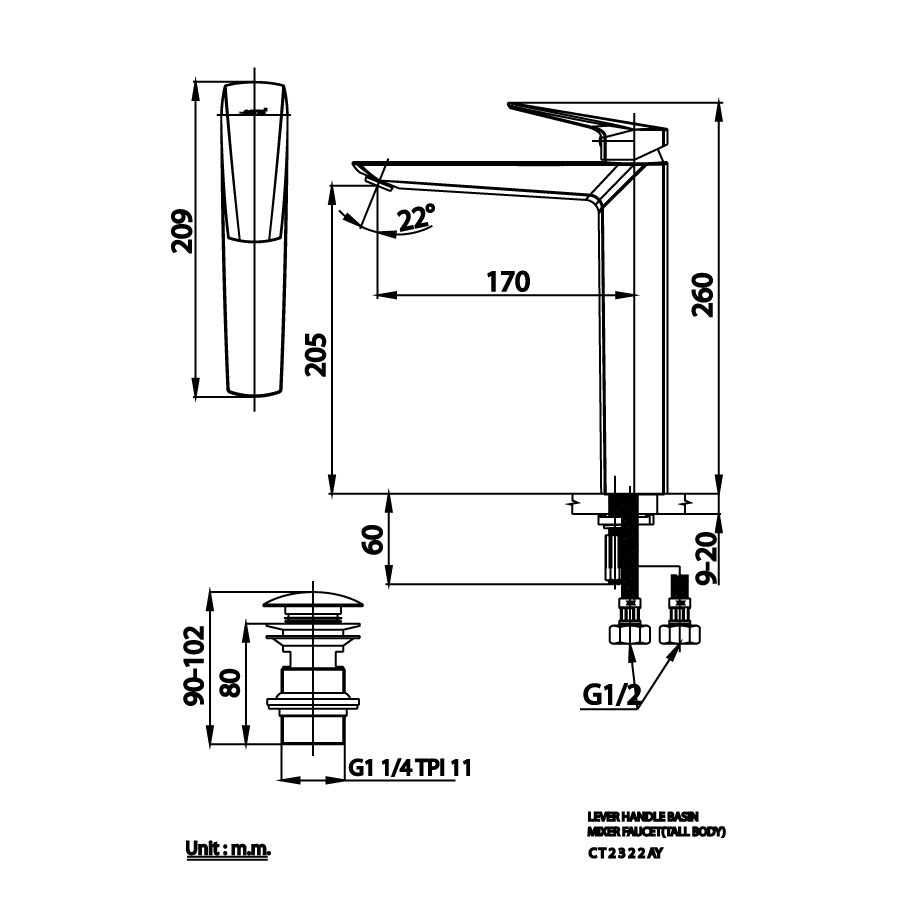 Bản vẽ kích thước vòi nóng lạnh COTTO CT2322AY